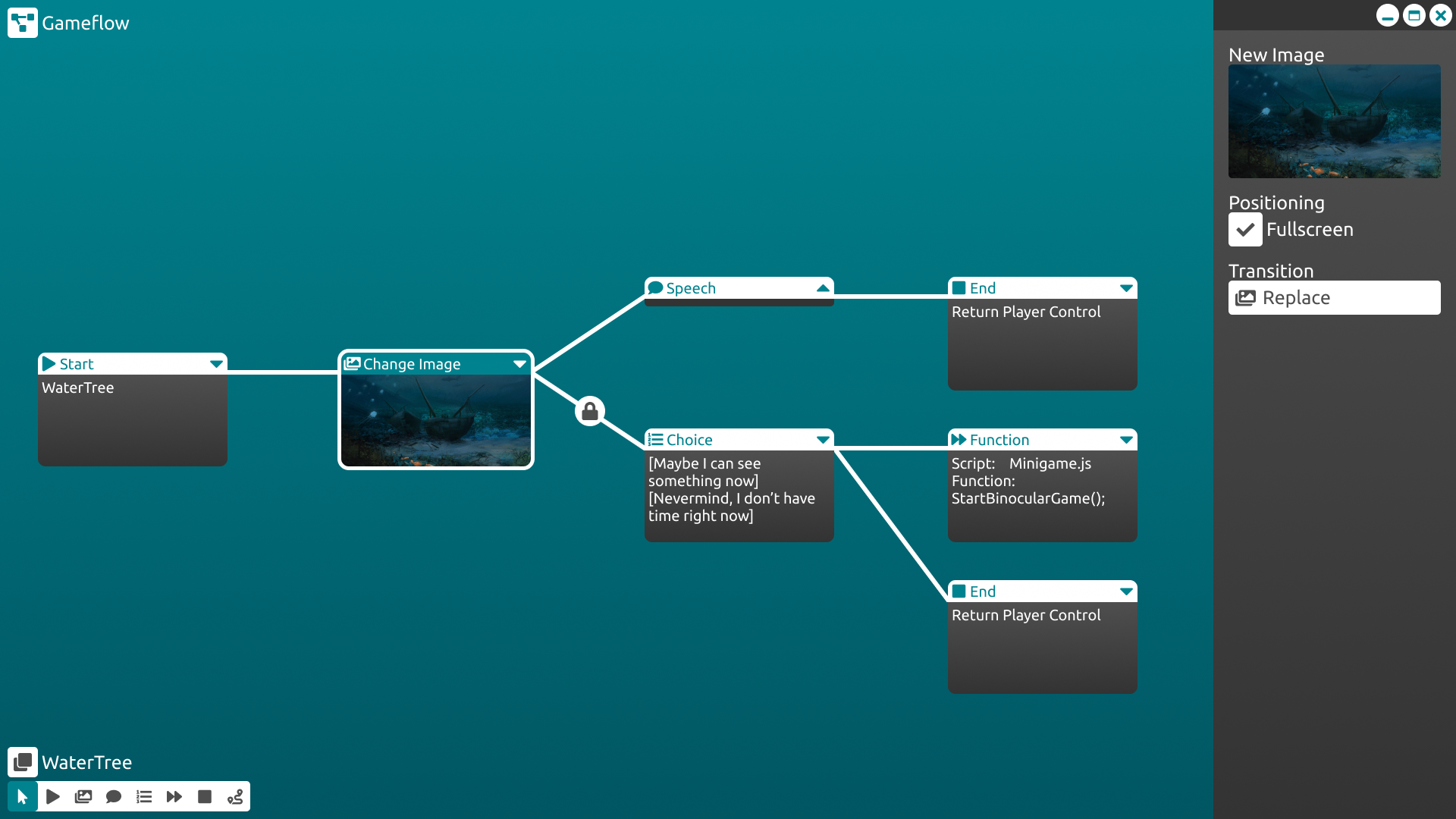 Game Flow: Construct conversation trees and game events using nodes.