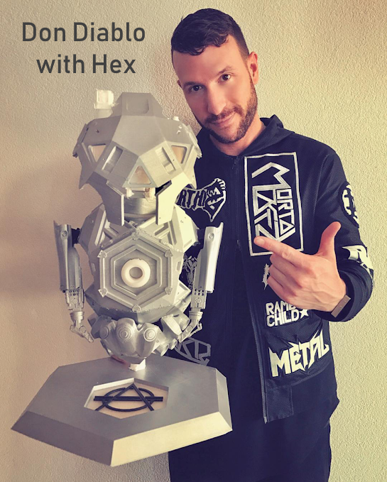 Don Diablo is a world-famous DJ from the Netherlands, who has created an entire fictional world called "Hexagonia" explored through his music videos, his music label Hexagon, and his comic books. One of the characters is Hex, a robot sidekick featured in some of his videos. For Don Diablo's birthday, I modelled, 3D printed, and engineered a real life version of Hex that lights up.Starting with the original CG model (provided to me), it soon became clear the model would need a lot of cleanup and modifications before I could 3D print it. The first thing I did was set up a workflow in Blender to automate retopology in order to clean up the mesh, followed by digitally assembling the resulting parts. After drawing out the locations for the LEDs, I designed a frame that would hold all floating parts without being visible from the outside, and which would allow some movement in the arms to prevent them from breaking off while also allowing the model to be slightly posed.